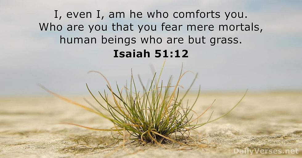 12 “I, I am he who comforts you; who are you that you are afraid of man who dies, of the son of man who is made like grass, 13 and have forgotten the Lord, your Maker, who stretched out the heavens and laid the foundations of the earth, and you fear continually all the day because of the wrath of the oppressor, when he sets himself to destroy? And where is the wrath of the oppressor? 14 He who is bowed down shall speedily be released; he shall not die and go down to the pit, neither shall his bread be lacking. 15 I am the Lord your God, who stirs up the sea so that its waves roar— the Lord of hosts is his name. 16 And I have put my words in your mouth and covered you in the shadow of my hand, establishing[c] the heavens and laying the foundations of the earth, and saying to Zion, ‘You are my people.’”