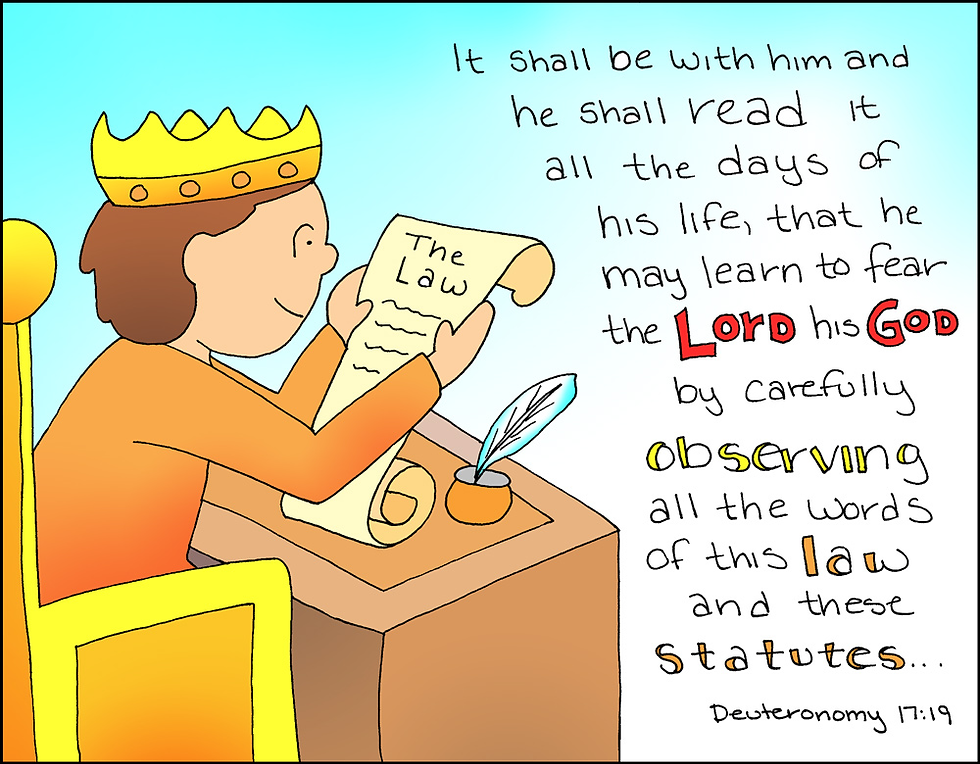 18 “And when he sits on the throne of his kingdom, he shall write for himself in a book a copy of this law, approved by[a] the Levitical priests. 19 And it shall be with him, and he shall read in it all the days of his life, that he may learn to fear the Lord his God by keeping all the words of this law and these statutes, and doing them, 20 that his heart may not be lifted up above his brothers, and that he may not turn aside from the commandment, either to the right hand or to the left, so that he may continue long in his kingdom, he and his children, in Israel.